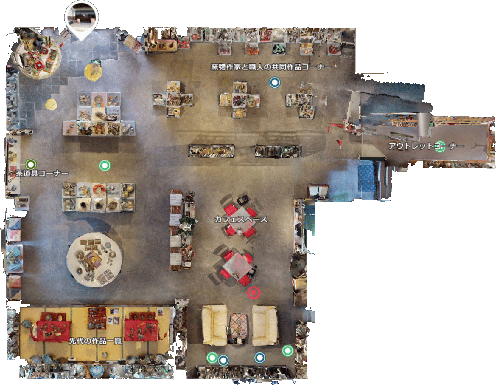 ウォークスルー機能◎で表示されるポイントをクリックorタップする事により、施設内部を自由に移動する事ができます。3Dモデルによりシームレスに画面が切り替わります。
